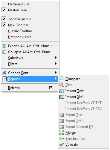 The View Menu controls the available display options. You can switch between how your entries are shown: either as a single list (Flattened List) or organized by category (Nested Tree). You can choose whether or not to display a toolbar, and if so, whether to use the 'Classic' or 'New' toolbar icons. The toolbar itself is also customizable. You can also expand or collapse all the groups displayed in the Nested Tree view, display subsets of the entries, filter the entries displayed to match any criteria, select the font in which the entries are displayed and display reports of merge, compare, import and other advanced operations.